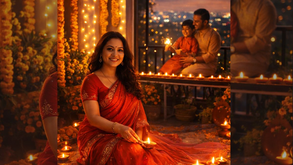 "Show a cosy Diwali evening with glowing diyas on a balcony, warm yellow lights, marigold flowers, and a relaxed family vibe, cinematic lighting, and realistic details।"