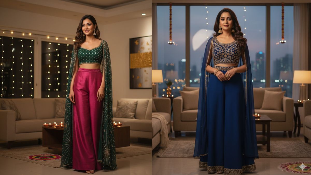 Generate a stylish 4K portrait of a person in a fusion festive outfit, standing in a modern home with subtle Diwali decor.