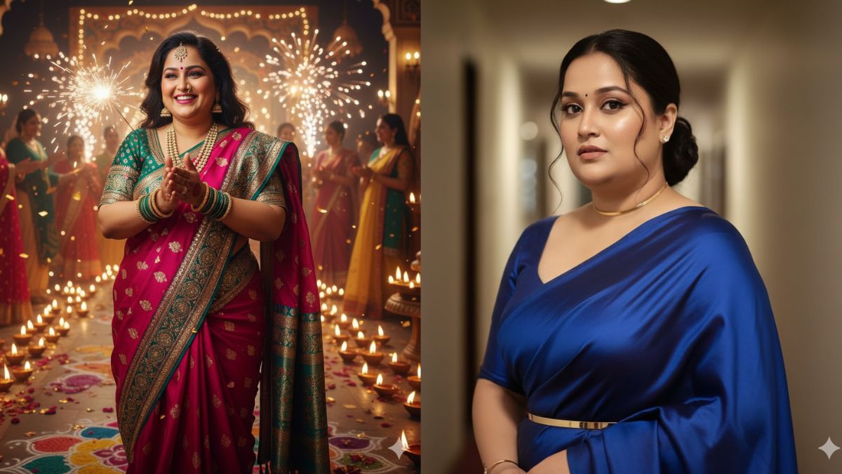 प्रॉम्प्ट - Create a full-color, dynamic shot of the woman in this photo, in a brightly coloured, heavily embroidered saree. The photo should capture all the vibrant details, sparkling jewelry, and a joyous, celebratory atmosphere, suitable for an Indian festival like Diwali.