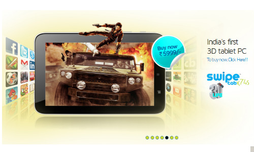 स्वाइप 3डी टैबलेट में एंड्रॉएड 4.0.3 आईस्क्रीम सैंडविच ओएस दिया गया है। टैबलेट में 7 इंच की फाइव प्वाइंट कैपेसिटिव टच स्क्रीन दी गई है जो 800 x 480 पिक्सल रेज्यूलूशन को सपोर्ट करती है। टैब में 1.5 गीगाहर्ट का कार्टेक्स ए13 प्रोसेसर और 4जीबी की इंटरनल मैमोरी दी गई है। बेहतर बैटरी बैकप के लिए स्वाइप 3डी मॉडल में 3400 एमएएच बैटरी इनबिल्ड है जो 5 से 6 घंटे का बैटरी बैकप देती है। इंटरनेट कनेक्टीविटी के लिए 3जी और वाईफाई के साथ यूजर वीडियो कॉलिंग भी कर सकता है। भारतीय बाजार में स्वाइन ने 3डी मॉडल को 5,999 रुपए में लांच किया है।