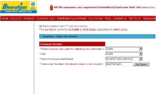 - रजिस्ट्रेशन करने के लिए अपने पीसी या फिर लैपटॉप में www.ebharatgas.com साइट को ओपेन करें और उसमें अपना कंज्यूमर नंबर और जिस एजेंसी से आपको का कनेक्शन है उसे भरें।