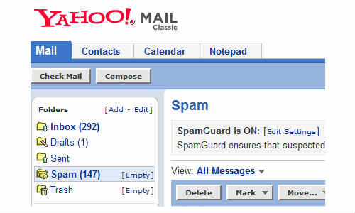 याहू यूजर्स अपने एकाउंट पर लॉग इन करें और दायीं तरफ दिए गए ऑप्शन पर क्लिक करें, ऑप्शन पर क्लिक करते ही एक ड्रॉप डाउन मेनू खुलेगा जिसमें मोर के ऑप्शन को चूज़ करें, इसके बाद बायीं तरफ दिए गए फिल्टर के बॉक्स को सेलेक्ट कर एडिट फिल्टर में स्पैम मेल या फिर ब्लॉक साइटों का नाम डाल दें और नीचे दिए गए मूव टू ट्रैश ऑप्शन पर टिक लगा दें। अब आपके मेल बाक्स पर कोई भी स्पैम मेल नहीं आएगी।