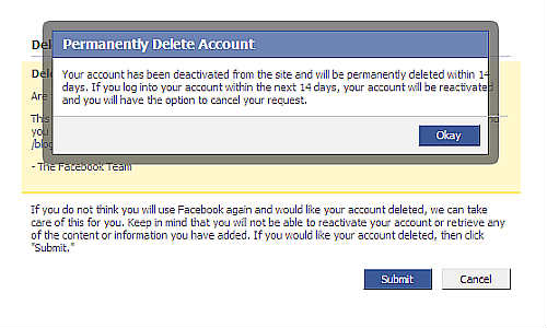 अगर आप फेसबुक पर लॉग-इन नहीं हैं, तो सबसे पहले आपको लॉग इन होना पडेगा। इसके बाद यहां आपको सबमिट बटन पर क्लिक करना पडेगा। यूआरएल डालते ही आपके सामने एकाउंट डिलीट का ऑप्शन खुलकर सामने आ जाएगा। ध्यान रखे की सबमिट करने के बाद दो सप्ताह तक अपने एकाउंट को लॉग-इन ना करें। इस तरह आपका अकाउंट डिलीट हो जाएगा।