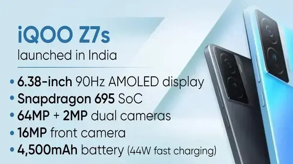 iQoo Z7s 5G को सोमवार को भारत में लॉन्च कर दिया गया है। स्मार्टफोन iQoo Z7 सीरीज का लेटेस्ट स्मार्टफोन है। कंपनी ने इस साल की शुरुआत में iQoo Z7 5G मॉडल लॉन्च किया था, जिसमें मीडियाटेक डाइमेंसिटी 920 SoC और 44W फ्लैश चार्ज सपोर्ट के साथ 4,500mAh ली-आयन बैटरी यूनिट है। हालाँकि, फोन क्वालकॉम के ऑक्टा-कोर स्नैपड्रैगन 695 SoC पर बेस्ड है। हैंडसेट दो रैम वेरिएंट के साथ आता है और इसे दो कलर ऑप्शन में पेश किया गया है।