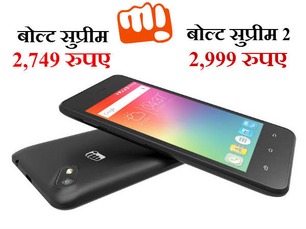 माइक्रोमैक्स ने शुक्रवार को एंट्री लेवल के दो नए स्मार्टफोन लॉन्च किए हैं। बोल्ट सुप्रीम की कीमत 2,749 रुपए है जबकि बोल्ट सुप्रीम 2 को 2,999 रुपए में पेश किया गया है। कंपनी का कहना है कि ये दोनों ही फोन उन यूजर्स के लिए खास हैं जो पहली बार स्मार्टफोन यूज़ करने जा रहे हैं।