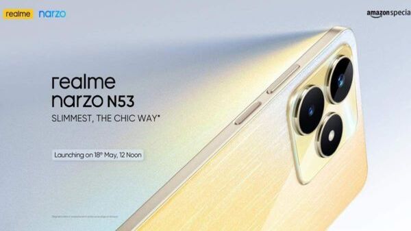 Realme ने भारत में नया Realme Narzo N53 लॉन्च किया है। Narzo N-सीरीज के तहत केवल दो महीनों में यह दूसरा फोन है। इनमें से पहला Narzo N55 है, जिसे कंपनी ने 10,999 रुपये की शुरुआती कीमत के साथ लॉन्च किया था। रियलमी का दावा है कि Narzo N53 अभी तक Narzo सीरीज में कंपनी का "सबसे पतला स्मार्टफोन" है। इसमें स्टाइलिश गोल्ड फिलामेंट कोटिंग और कैलिफोर्निया सनशाइन डिजाइन भी है।