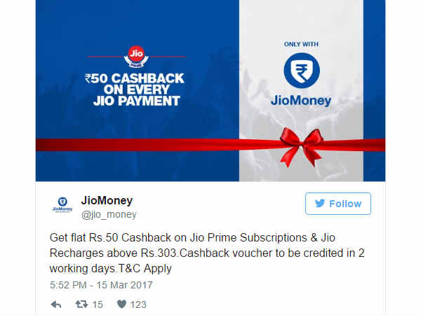 रिलायंस जियो की जियो मनी एप के ट्विटर हैंडल से इस बात की जानकारी दी गई है। रिलायंस जियो यूज़र्स जियो मनी एप के साथ रिचार्ज कर एक साल की जियो प्राइम मेंबरशिप को फ्री में पा सकते हैं।