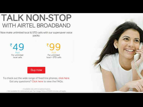 अगर आपके घर में एयरटेल ब्रॉडबैंड लगा है और साथ में लैंडलाइन डिवाइस भी लगी हुई है तो उसमें वॉयस पैक एक्टीवेट करने के लिए अपने रजिस्टर्ड नंबर से 53636 पर SMS करें।