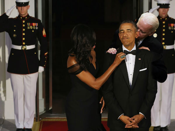 आजकल फोटोशॉप का जमाना है। लोग एक तस्वीर को कई तरह से बदल सकते हैं। ऐसा ही कुछ इस तस्वीर के साथ भी हुआ है। यह तस्वीर अमेरिका के राष्ट्रपति बराक ओबामा और उनकी पत्नी मिशेल ओबामा की है। इस तस्वीर में मिशेल ओबामा अपने पति और बराक ओबामा की टाई ठीक करते हुए नजर आ रही है। यह तस्वीर 26 सितम्बर को स्टेट डिनर पर ली गयी है। यह तस्वीर उस दिन की शानदार तस्वीरों में से एक है।