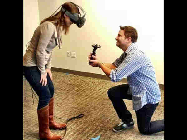 अब इन इंजिनियर भाई-साहब शंडलर मर्च को ही देख लीजिए। यह काम करते हैं एक विडियो गेम कंपनी में, तो जाहिर हर दिन नई-नई टेक चीजों से इनका मिलना-जुलना लगा ही रहता है। इंजिनियर साहब को मिला एचटीसी वाईव वीआर हेडसेट। ये जनाब इस हेडसेट की मदद से अपनी गर्लफ्रेंड को प्रोपोज करने पहुंचे।
