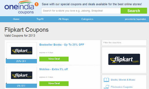 उदाहरण अगर आपको फ्लिपकार्ट से किताबे खरीदनी हैं तो फ्लिपकार्ट के बुक डिस्काउंट कूपन कोड पर क्लिक करें।