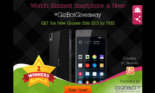 एक बार फिर गिजबोट आपके लिए फ्री स्मार्टफोन जीतने का सुनहरा मौका लाया है लेकिन इस बार आप एक नहीं बल्कि दो स्मार्टफोन जीत सकते हैं। गिजबोट गिवअवे में हम अब की बार आपके लिए लाए हैं जियोनी ई लाइफ 5.5 जीतने का सुनहरा मौका जो दुनिया का सबसे पतला स्मार्टफोन हैं। जियोनी ई लाइफ की मोटाई मात्र 5.55 मिलीमीटर है, इसमें फ्रंट कैमरे में 95 डिग्री का अल्ट्रा वाइड लेंस दिया गया है जिससे यूजर एक साथ बड़े ग्रुप की सेलफी भी बड़े आराम से ले सकता है। इसके अलावा इसमें कई दूसरे फीचर दिए गए हैं।