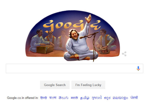 अपनी आवाज और सूफियाना अंदाज से सबको अपना दीवाना बनाने वाले पाकिस्तान के रहने वाले दिवंगत सूफी गायक नुसरत फ़तेह अली खान की 67वीं जयंती पर सर्च इंजन गूगल ने उनका डूडल बनाकर श्रद्धांजलि दी।