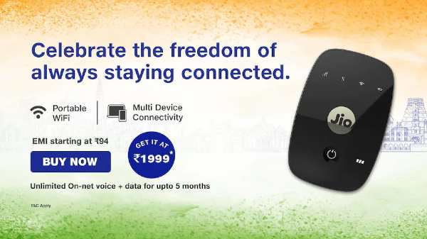 भारत में कल यानि 15 अगस्त को 74वां स्वतंत्रता दिवस मनाया जाएगा। इस मौके पर रिलायंस जियो कंपनी ने भी एक ऑफर पेश किया है। अगर आप इस ऑफर के तहत JioFi 4G को खरीदने पर 5 महीने तक मुफ्त में इंटरनेट डेटा दिया जाएगा और जियो से जियो पर कॉल करने के लिए भी मुफ्त सुविधाएं दी जाएगी।