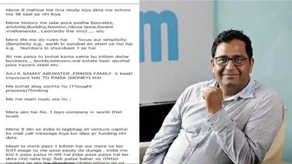 पेटीएम (Paytm) के सीईओ विजय शेखर शर्मा ने अपने स्टार्टअप आइडिया के लिए फंडिंग की मांग करने वाले एक व्यक्ति से प्राप्त एक असामान्य ईमेल का स्क्रीनशॉट शेयर किया है। ईमेल में उस व्यक्ति ने कहा कि उसने अपने स्कूली जीवन के 18 वर्षों की तुलना में पिछले आठ महीनों में अधिक अध्ययन किया है। उन्होंने समझाया कि उन्होंने सुकरात, अरस्तू और न्यूटन से लेकर बुद्ध और स्वामी विवेकानंद तक सब कुछ पढ़ा है।