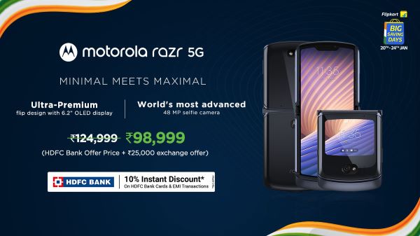 आपको बता दें कि एक बेहतरीन स्मार्टफोन पर 25,000 रुपए से 50,000 रुपए तक ऑफर पाने के लिए आपको फ्लिपकार्ट बिग सेविंग डेय्स सेल के जरिए शॉपिंग करनी पड़ेगी। आपको बता दें कि इतना बड़ा डिस्काउंट मोटोरोला कंपनी के फोल्डेबल स्मार्टफोन Motorola Razr 5G पर दिया जा रहा है।