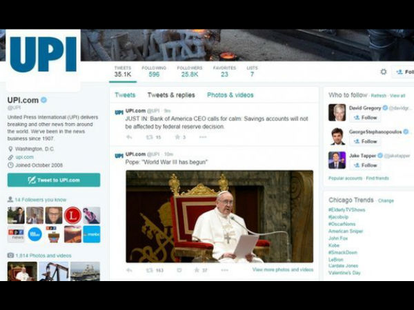 'न्यूयॉर्क पोस्ट' के ट्विटर अकाउंट से हैकरों एक फर्जी ट्वीट किया है, जिसके मुताबिक दक्षिण चीन सागर में अमेरिका तथा चीन की नौसेना पोतों के बीच जंग हो रही है। वहीं, 'यूपीआई' के ट्विटर अकाउंट से जारी एक सनसनीखेज फर्जी ट्वीट में कहा गया है कि पोप फ्रांसिस ने घोषणा की है कि 'तीसरा विश्वयुद्ध शुरू हो गया है।' द न्यूयॉर्क पोस्ट तथा यूपीआई इस हैकिंग की जांच कर रहे हैं।