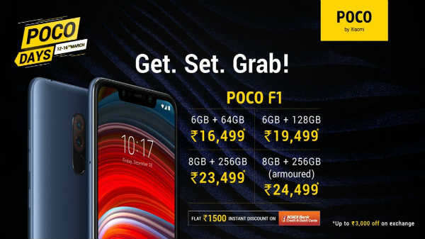 शाओमी ने फ्लिपकार्ट, Mi Home Store, Mi ऑनलाइन स्टोर के साथ-साथ कुछ चुनिंदा रिटेल स्टोर पर Poco Days सेल का आयोजन कर दिया है। कंपनी इस सेल को 12 मार्च से लेकर 16 मार्च तक आयोजित की गई है। लिहाजा आज इस सेल का आखिरी दिन है। ग्राहकों को ज्यादा से ज्यादा फायदा देने के लिए कंपनी ने ICICI बैंक के साथ साझेदारी भी कर ली है। जिसके चलते ICICI बैंक के डेबिट या क्रेडिट कार्ड से स्मार्टफोन खरीदने पर फ्लैट 1,500 रुपये का डिस्काउंट पाया जा सकता है।