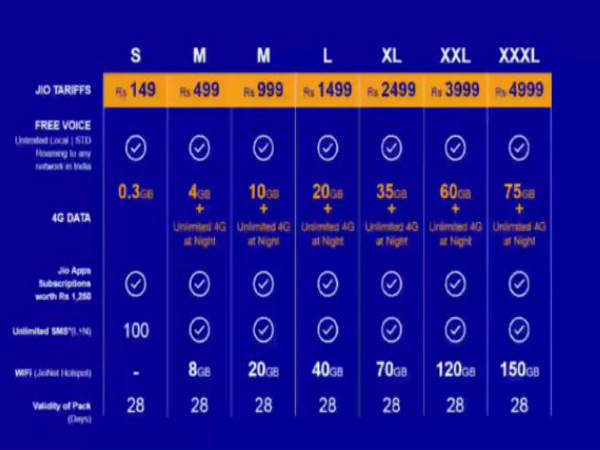 रिलायंस जियो के टैरिफ प्लान 149 रु से शुरू होकर 4999 रु तक हैं। स्मॉल S साइज़ से और आपको मिलते हैं XXXL साइज़ तक में प्लान उपलब्ध हैं।