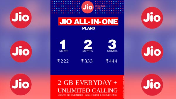 जियो कंपनी ने ऑल इन प्लान्स को पेश किया है। इन प्लान्स की कीमत 222, 333, 444 रुपए है। जियो कंपनी का कहना है कि वो किफायती कीमत में एक ही प्लान के अंदर सभी सर्विस की सुविधाएं दे रही है। 222 रुपए का प्लान एक महीने वाला है। इसमें यूज़र्स को 2 जीबी इंटरनेट डेटा रोज मिलेगा। इसके साथ-साथ जियो टू जियो अनलिमिटेड कॉलिंग और जियो से दूसरे नेटवर्क पर कॉल करने के लिए 1000 मिनट की मिलेंगे। इस प्लान की वैधता 1 महिने की होगी।