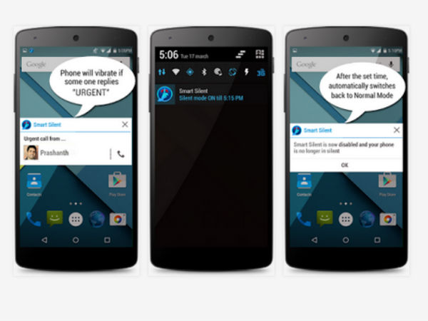 स्मार्ट साइलेंट एप अब आपको फोन साइलेंट होने पर भी जरूरी कॉल की जानकारी देगी। अगर आप अपने फोन से साइलेंट मोड हटाना भूल गए हैं तो टेंशन लेने की कोई जरूरत नहीं स्मार्ट साइलेंट एप ऑटोमेटिंग आपका फोन साइलेंट मोड से हटा देगी। यानी आप अपना फोन आराम से पॉकेट में रखकर बेफ्रिक होकर ट्रेवल कर सकते हैं। Smart silent app मार्केट में (21st Mar 2015) लांच हो चुकी है यानी इसे आप गूगल प्ले में जाकर फ्री डाउनलोड कर सकते हैं।