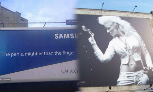 "the penis mightier than the finger, samsung billboard in egypt" इसे पड़कर ही आप समझ गए होंगे इसमें क्या गलती है सैमसंग ने इस प्रचार में गैलेक्सी नोट के स्टायलस को Pen से दर्शाया है कि लेकिन गलती है pens की जगह इसके बीच में i भी लग गया है जिससे ये penis हो गया है जिसका मतलब कुछ और ही निकल रहा है।