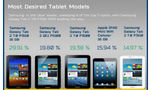 वहीं टैबलेट यूजरों पर नजर डालें तो उनकी पहली पसंद एप्पल है वहीं दूसरे नंबर पर सैमसंग को और तीसरे पर माइक्रोमैक्स के टैबलेट पसंद किए जाते हैं। भारतीय बाजार में सबसे ज्यादा पसंद किए जाने वाले मॉडलों में सैमसंग का गैलेक्सी टैब 2 7.0 पी 3110 सबसे ज्यादा पॉपुलर है वहीं दूसरे और तीसरे नंबर में भी सैमसंग के ही गैलेक्सी टैब 2 10.1 और गैलेक्सी टैब 2 7.0 सबसे पसंद किए जाने वाले मॉडल है। सैमसंग, माइक्रोमैक्स और कार्बन टैबलेट मार्केट में सबसे तेजी से बढ़ते हुए मॉडलों में से एक हैं। जबकि एचसीएल, जिंक और लिनोवो की लोकप्रियता में कमी आई है।