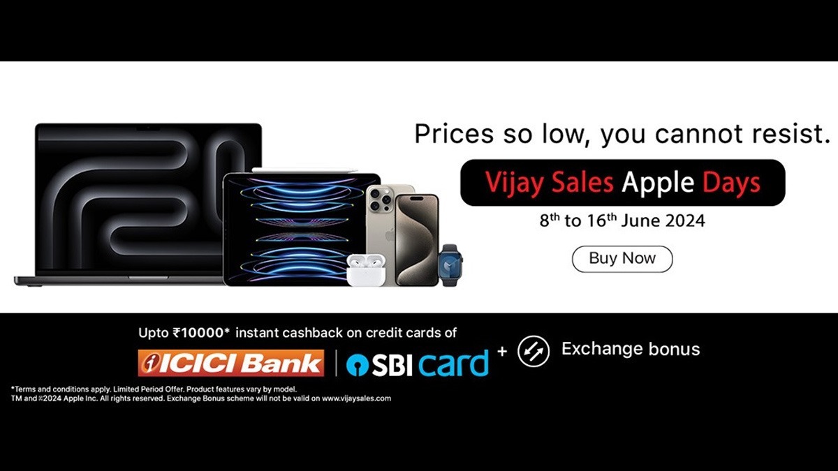बता दें, इस विजय सेल्स Apple Days सेल में आप iPhones, MacBooks, iPads, Watches सहित अन्य Apple प्रोडक्ट्स पर खास छूट दिया जा रहा है। साथ ही ICICI और SBI बैंक कार्ड धारकों को Apple प्रोडक्ट्स पर 10,000 रुपये तक की इंस्टेंट डिस्काउंट का भी लाभ मिल रहा हैं।