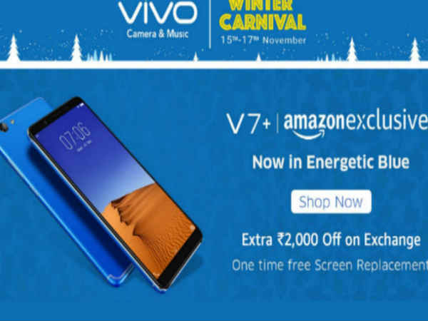 अमेजन इंडिया पर Vivo Winter Carnival में डिस्काउंट और ऑफर्स की लिस्ट में सबसे पहले आता है Vivo V7+ स्मार्टफोन। इस फोन की कीमत पर 2,000 रुपए तक के एक्सचेंज ऑफर मिल रहा है। साथ ही अमेजन Vivo V7+ पर वन टाइम फ्री स्क्रीन रिप्लेसमेंट फ्री ऑफ कॉस्ट करेगा। vivo V7+ स्मार्टफोन में 5.99 इंच का एचडी+ डिसप्ले दिया गया है। साथ ही इस स्मार्टफोन में वीडियो कॉलिंग और सेल्फी के लिए 24-मेगापिक्सल का फ्रंट कैमरा दिया गया है। फोन में 3225mAH की नॉन रिमूवल लिथियम बैटरी दी गई है।